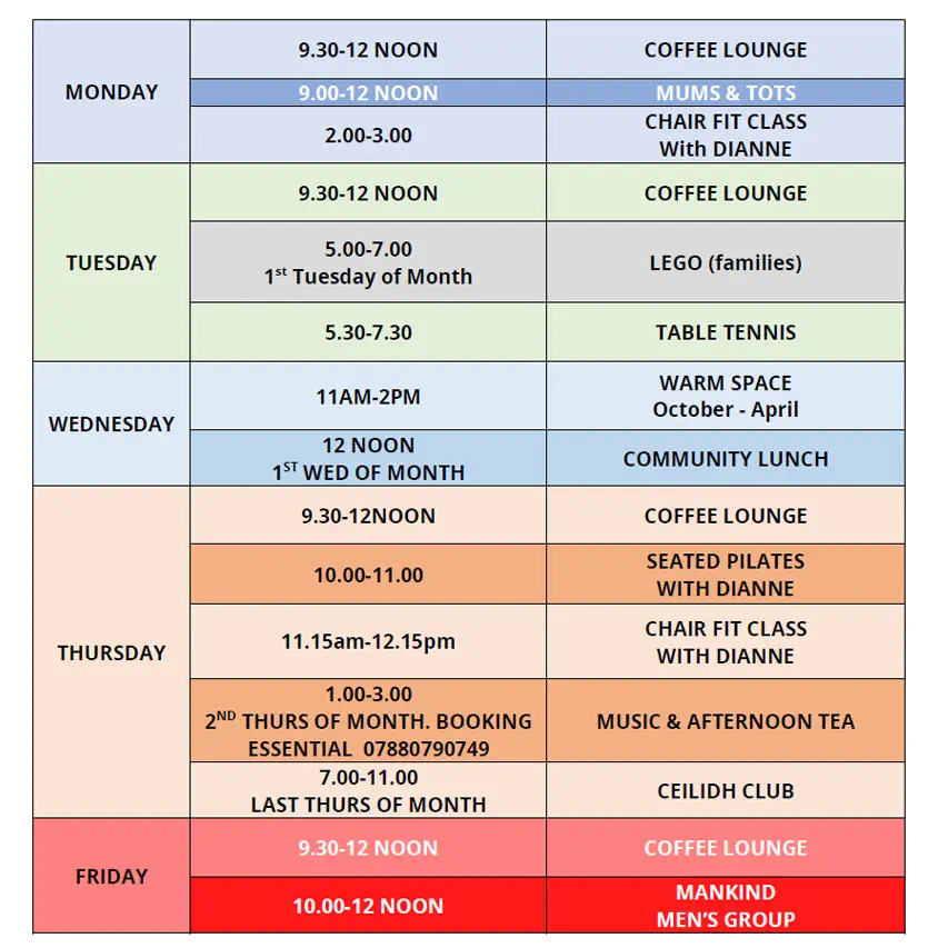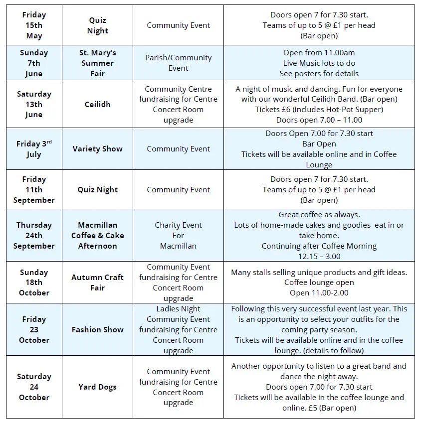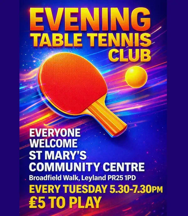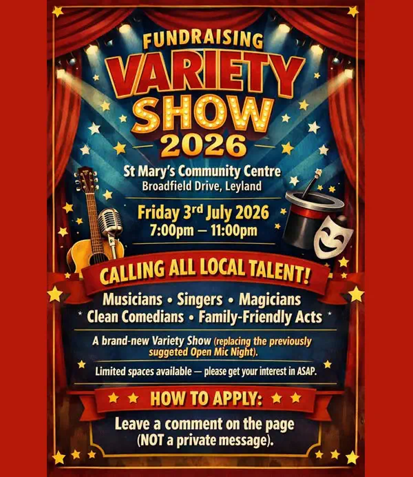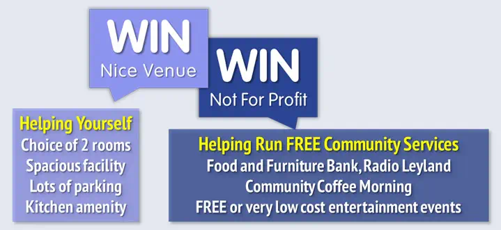 The Community Centre is a NOT FOR PROFIT operation run by volunteers. Function rooms are hired out to raise revenue so that the Community Centre can provide FREE OF CHARGE services to the community like the Leyland Food and Furniture Bank, Radio Leyland, Community Coffee Morning and FREE or very low cost entertainment events.